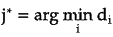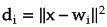 Step 4 - Weight vector comparison: The Euclidean distance between input vector x and each weight vector w_i is computed as:
