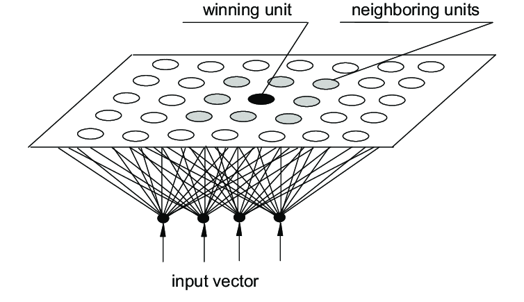 A Kohonen network in a two-dimensional grid of neurons, called a "map". The neurons are arranged in a topological manner, meaning that the spatial location of neurons on map reflects the underlying structure of input data, which aids in visualization as well.