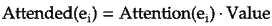 The attended output for token e_i is obtained by weighting value vectors of all tokens: